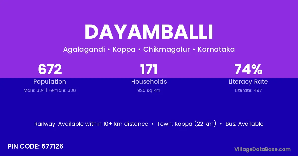 Koppa (22 km) is the nearest town to Dayamballi village for major economic activities and is located approximately 22 km away.