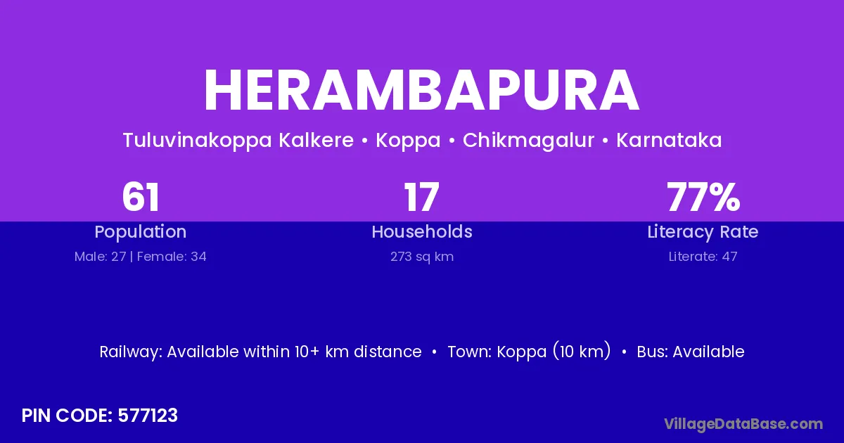 Herambapura village has a total population of 61 people, of which 27 are males and 34 are females.