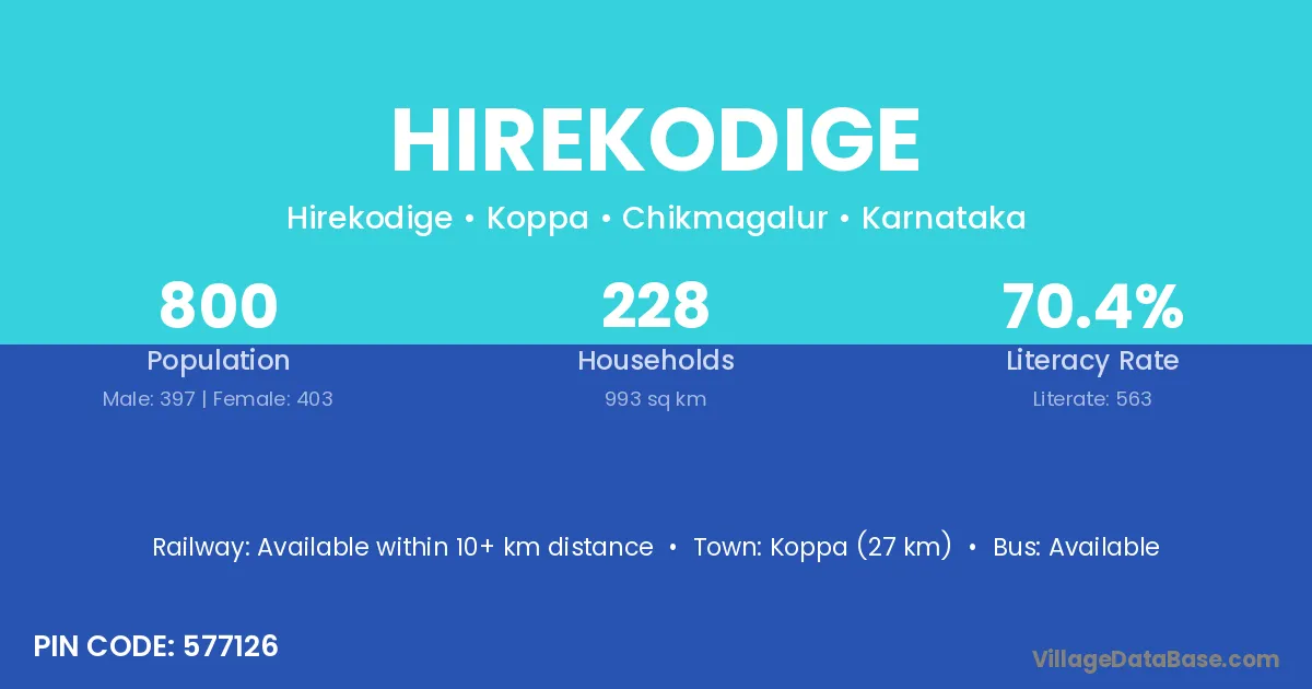 Koppa (27 km) is the nearest town to Hirekodige village for major economic activities and is located approximately 27 km away.