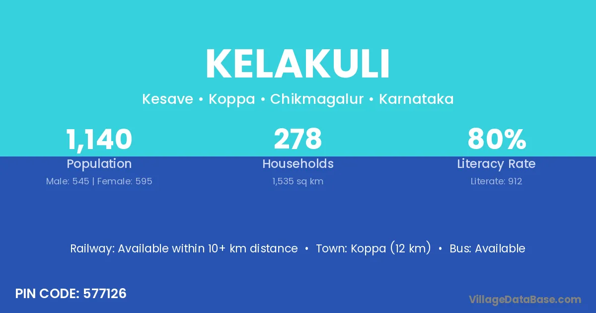 Koppa (12 km) is the nearest town to Kelakuli village for major economic activities and is located approximately 12 km away.