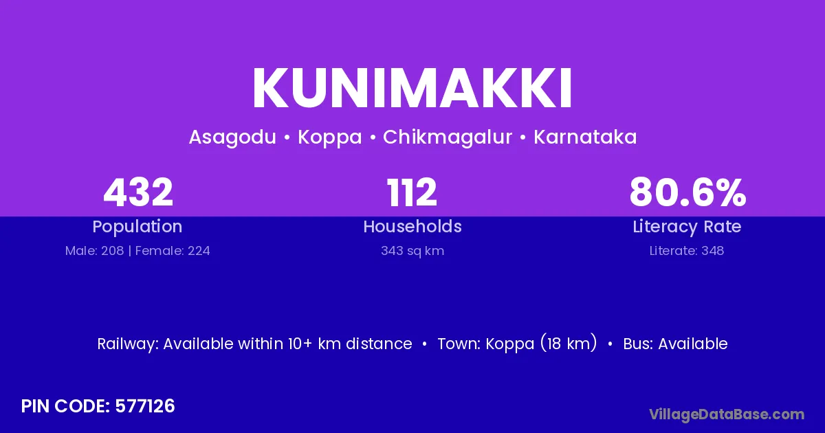 Koppa (18 km) is the nearest town to Kunimakki village for major economic activities and is located approximately 18 km away.