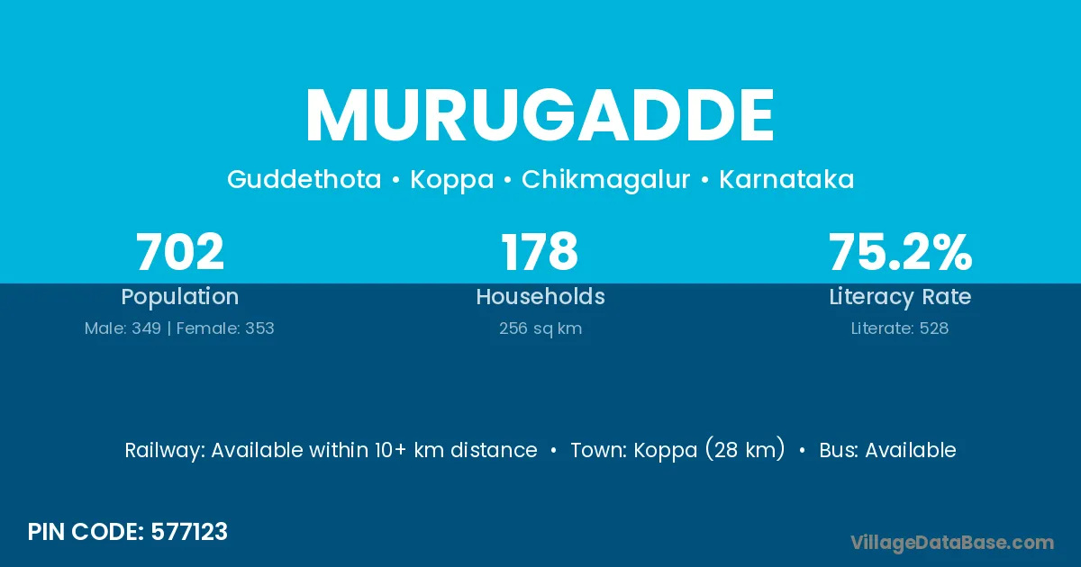 Koppa (28 km) is the nearest town to Murugadde village for major economic activities and is located approximately 28 km away.