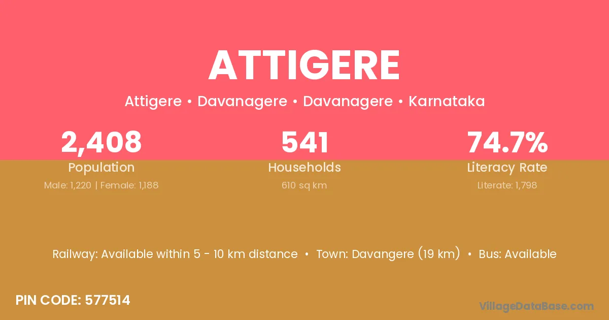 The literacy rate of Attigere village is 73.61%. Male literacy stands at 77.82% and female literacy at 69.75%.