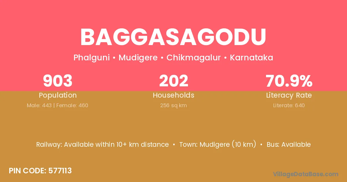 Mudigere (10 km) is the nearest town to Baggasagodu village for major economic activities and is located approximately 10 km away.
