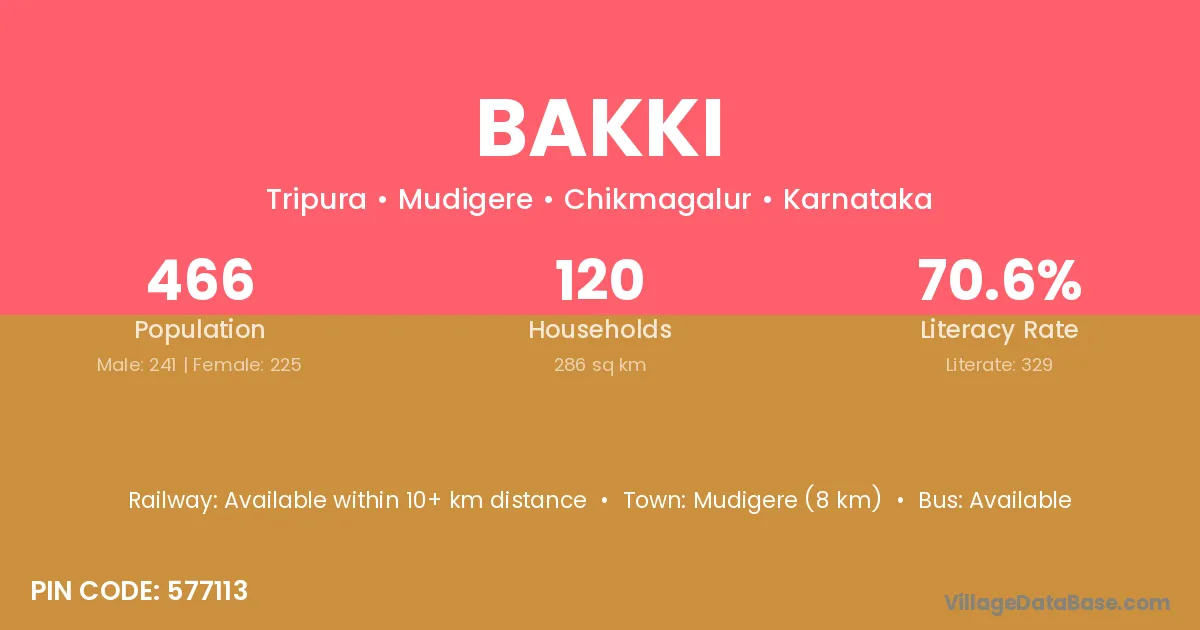 Mudigere (8 km) is the nearest town to Bakki village for major economic activities and is located approximately 8 km away.