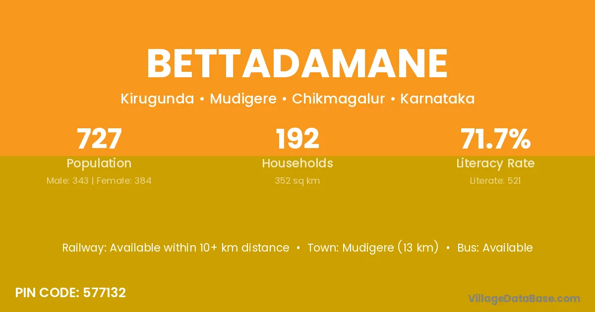 Mudigere (13 km) is the nearest town to Bettadamane village for major economic activities and is located approximately 13 km away.