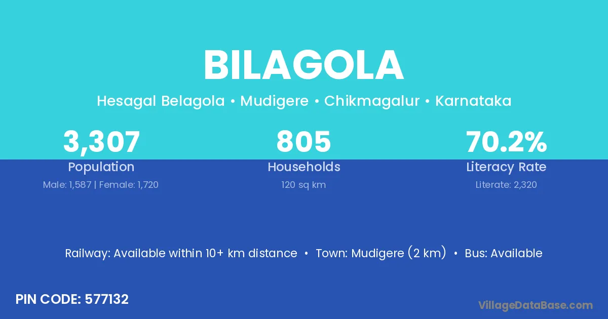 Mudigere (2 km) is the nearest town to Bilagola village for major economic activities and is located approximately 2 km away.
