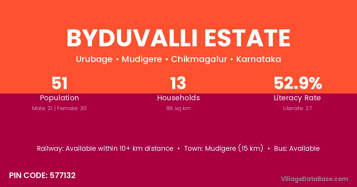 Byduvalli Estate village has a total population of 51 people, of which 21 are males and 30 are females.