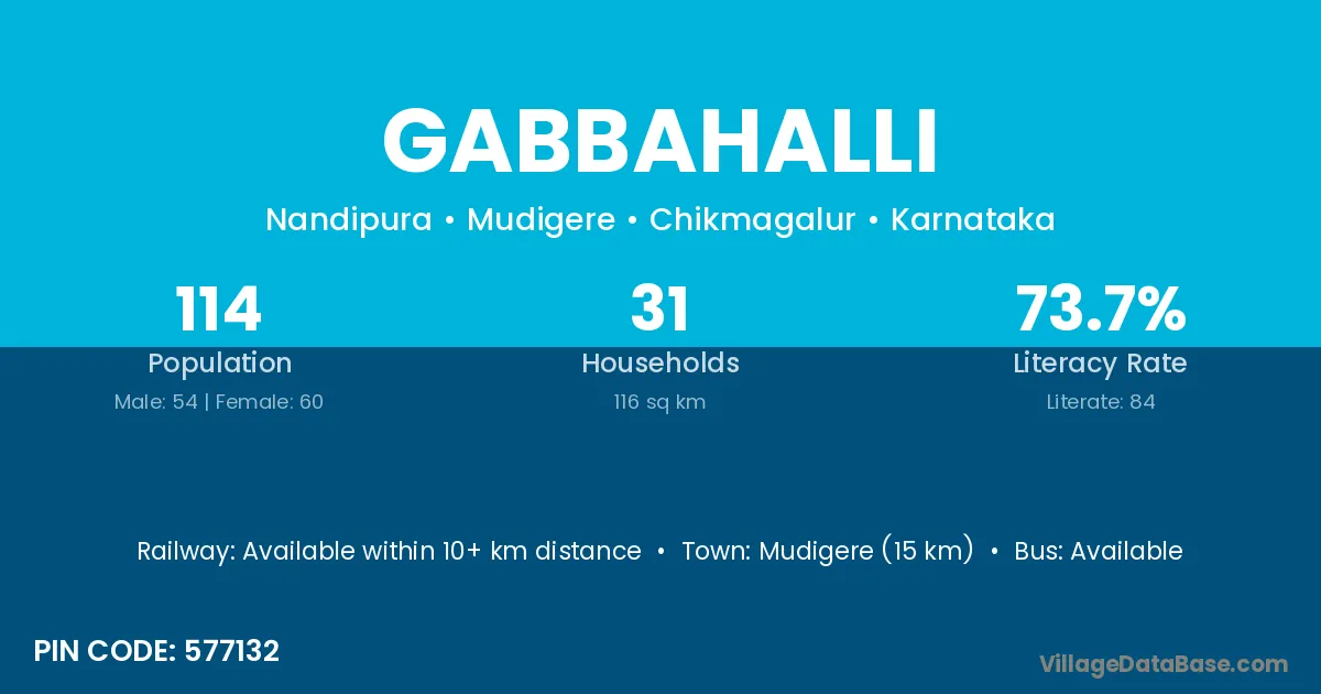 Mudigere (15 km) is the nearest town to Gabbahalli village for major economic activities and is located approximately 15 km away.