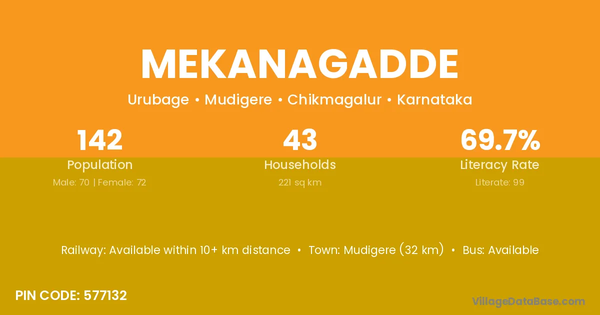 Mekanagadde village has a total population of 142 people, of which 70 are males and 72 are females.