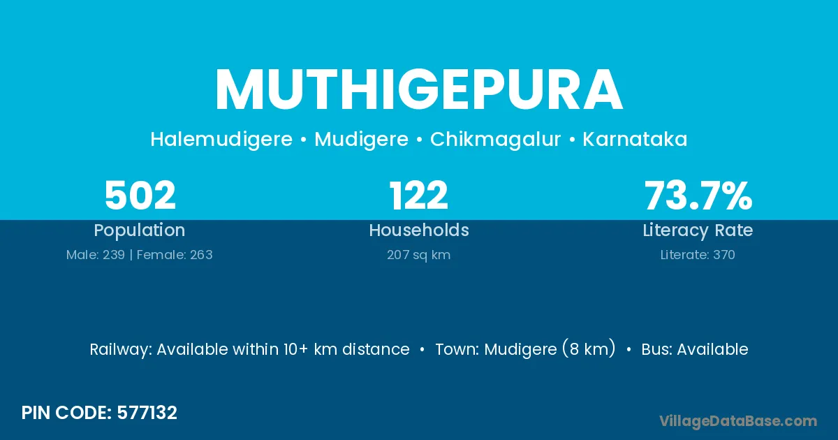 Muthigepura village has a total population of 502 people, of which 239 are males and 263 are females.