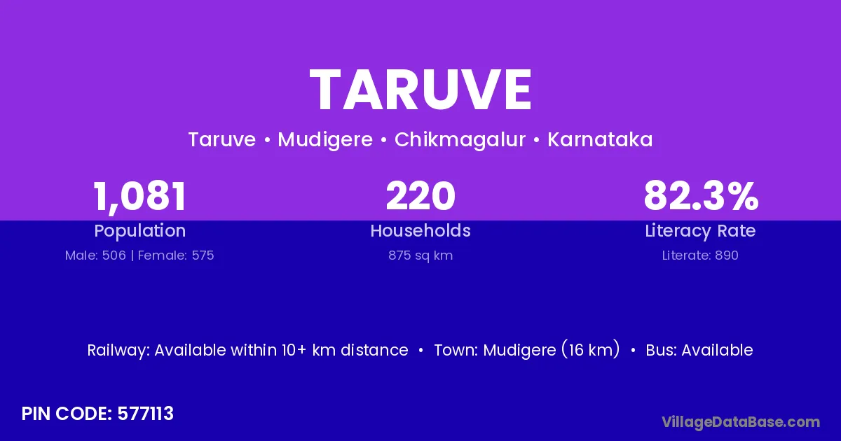 Mudigere (16 km) is the nearest town to Taruve village for major economic activities and is located approximately 16 km away.