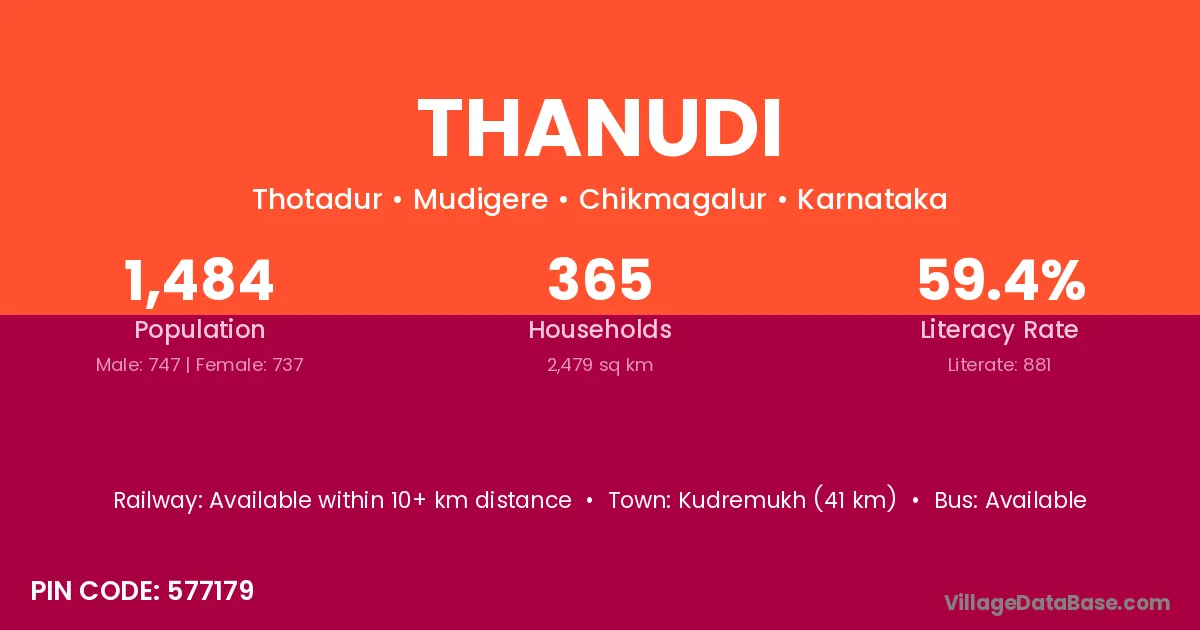Kudremukh (41 km) is the nearest town to Thanudi village for major economic activities and is located approximately 41 km away.