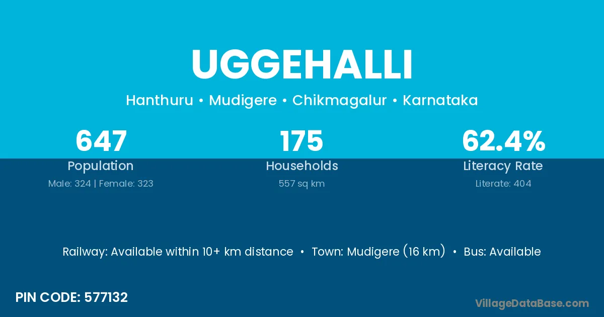 Mudigere (16 km) is the nearest town to Uggehalli village for major economic activities and is located approximately 16 km away.