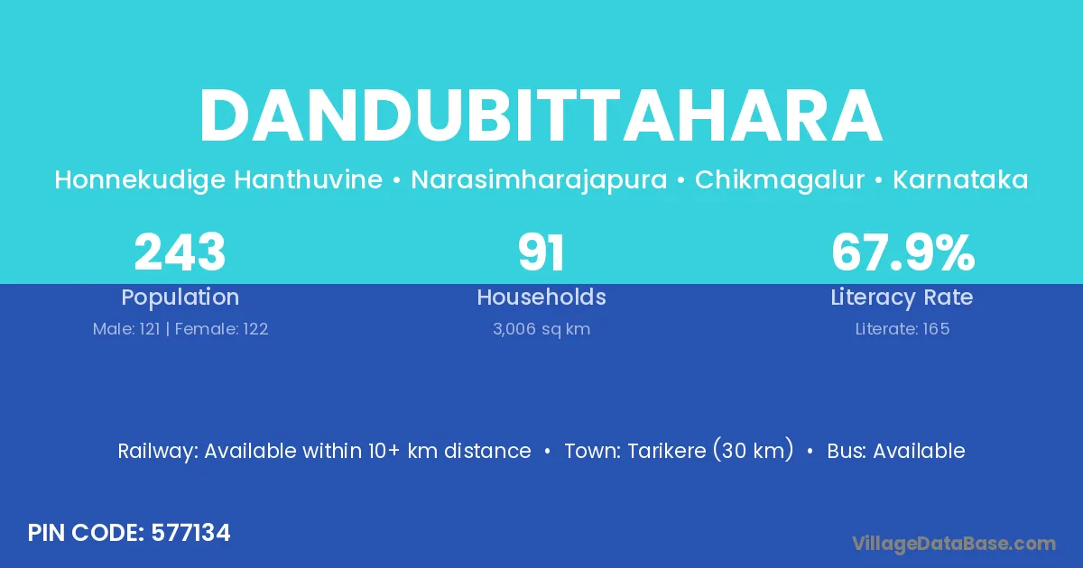Tarikere (30 km) is the nearest town to Dandubittahara village for major economic activities and is located approximately 30 km away.