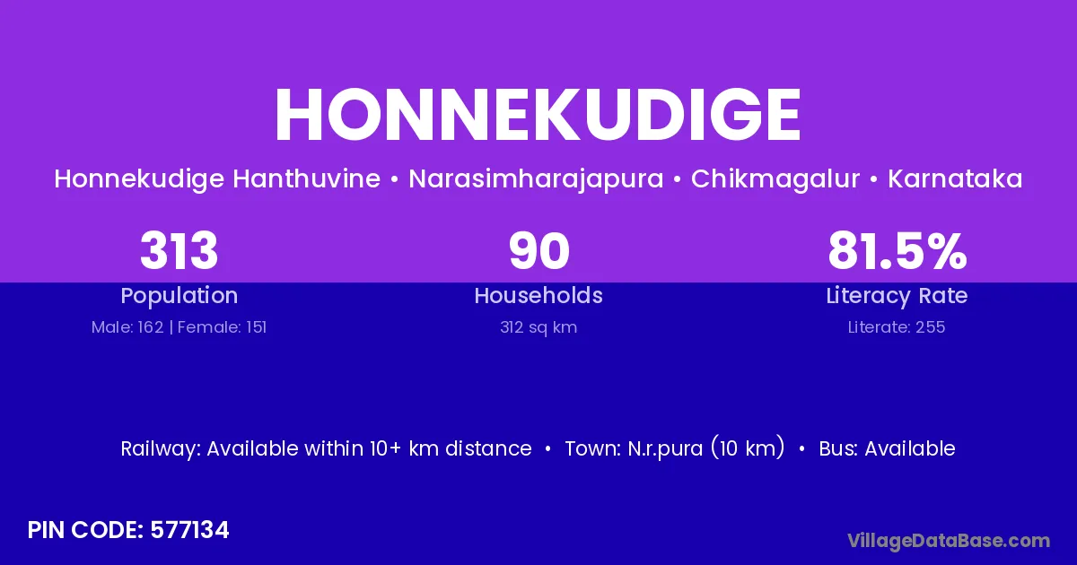 Honnekudige village has a total population of 313 people, of which 162 are males and 151 are females.