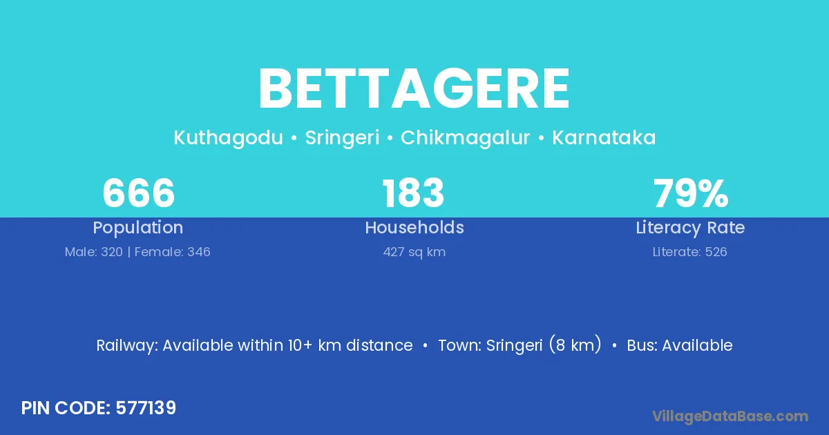 Sringeri (8 km) is the nearest town to Bettagere village for major economic activities and is located approximately 8 km away.
