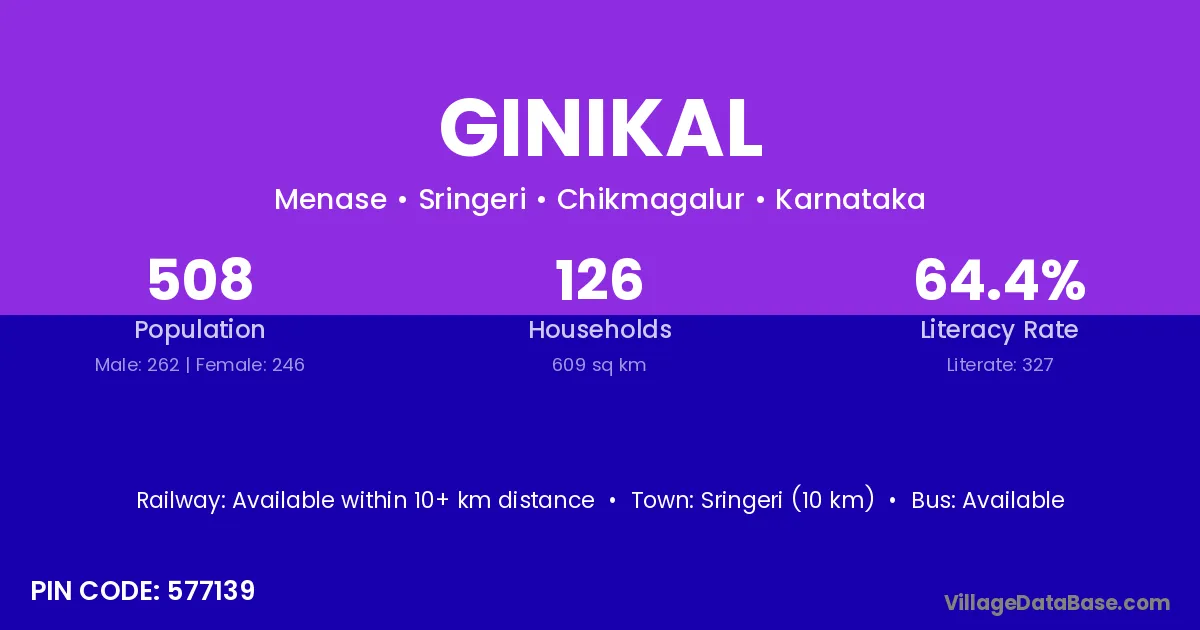 Sringeri (10 km) is the nearest town to Ginikal village for major economic activities and is located approximately 10 km away.