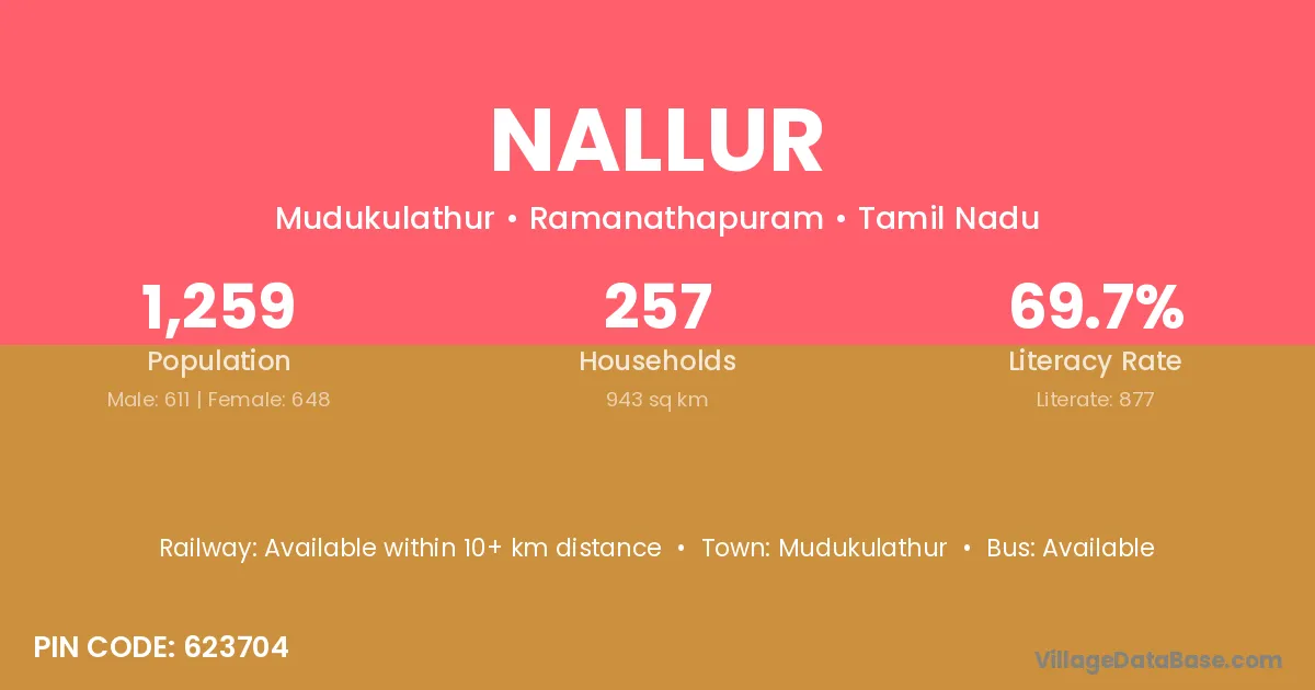 Nallur village has a total population of 233 people, of which 103 are males and 130 are females.