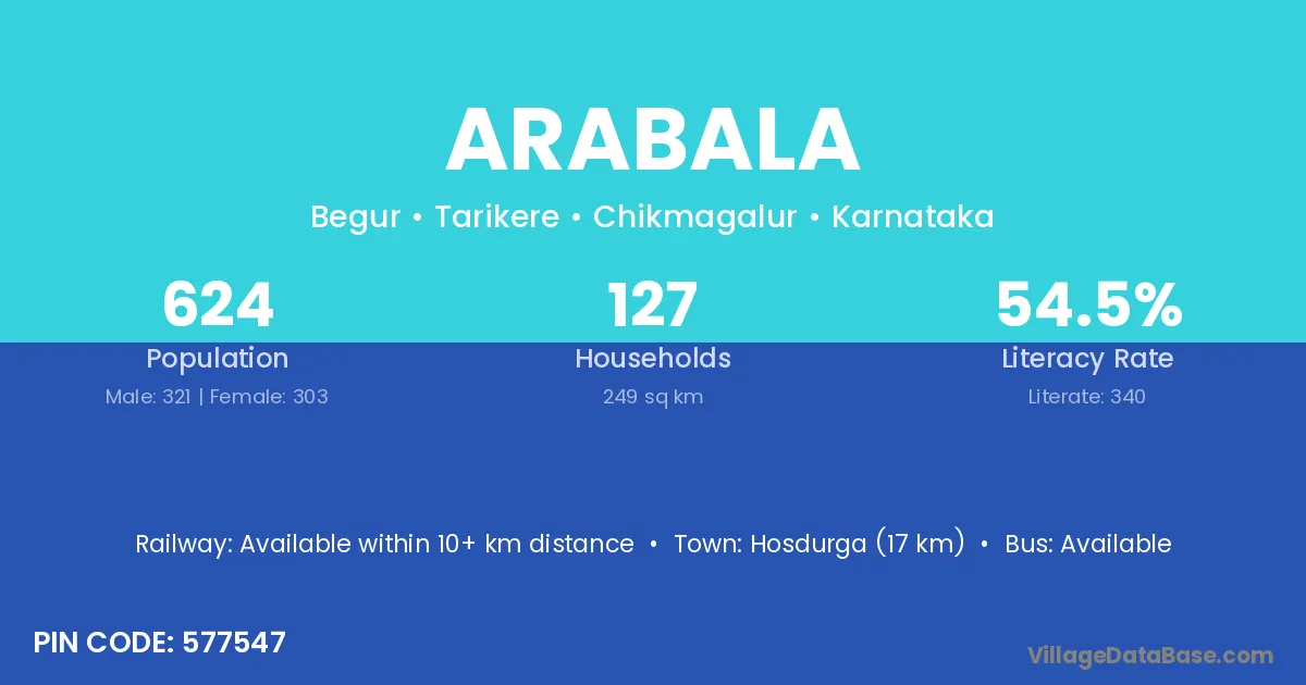 Hosdurga (17 km) is the nearest town to Arabala village for major economic activities and is located approximately 17 km away.