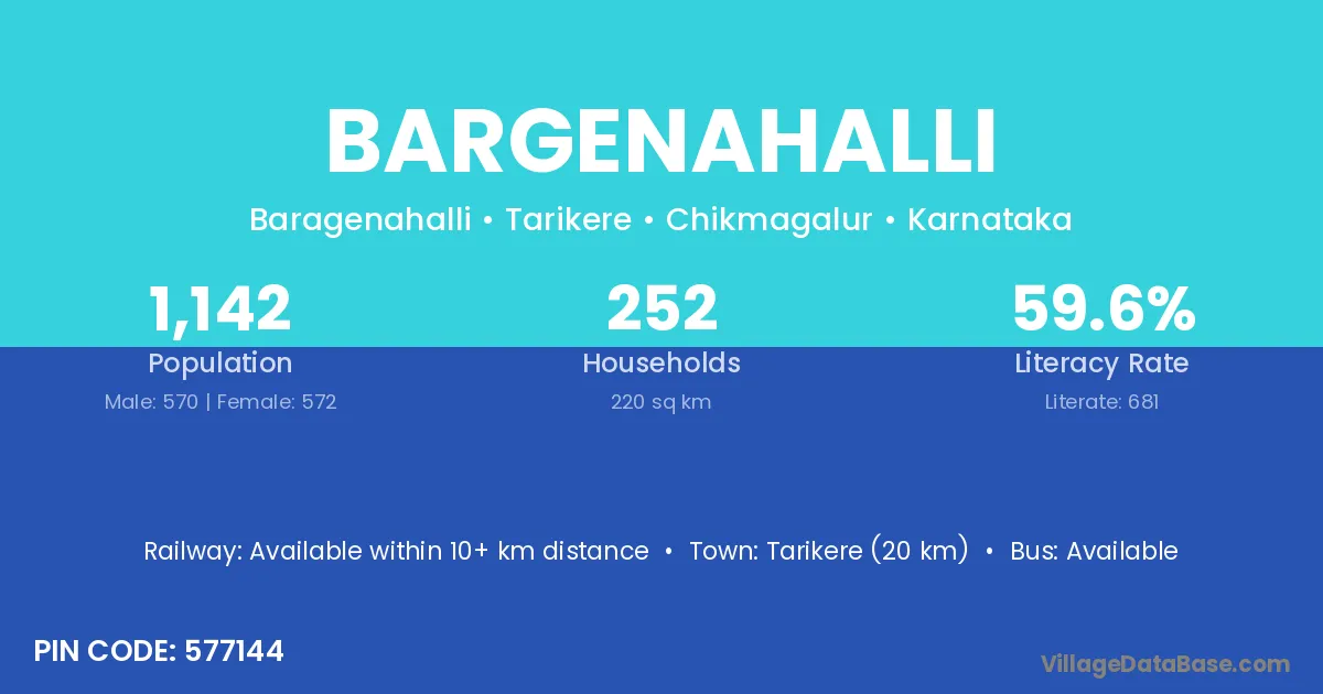 Bargenahalli village has a total population of 1,142 people, of which 570 are males and 572 are females.
