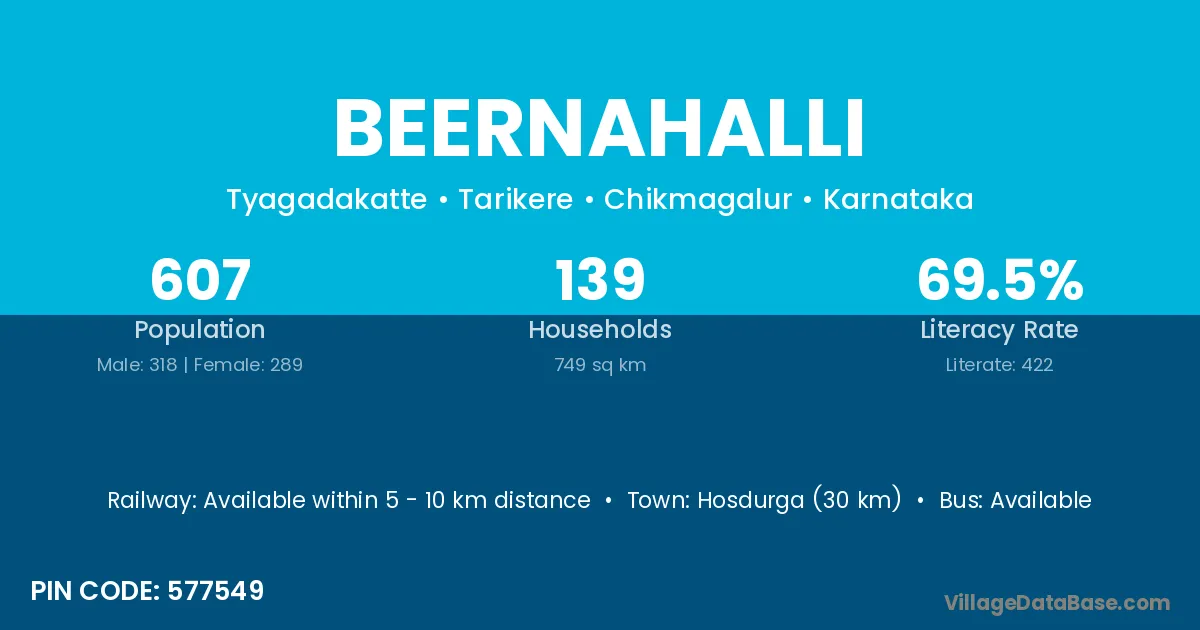 Hosdurga (30 km) is the nearest town to Beernahalli village for major economic activities and is located approximately 30 km away.
