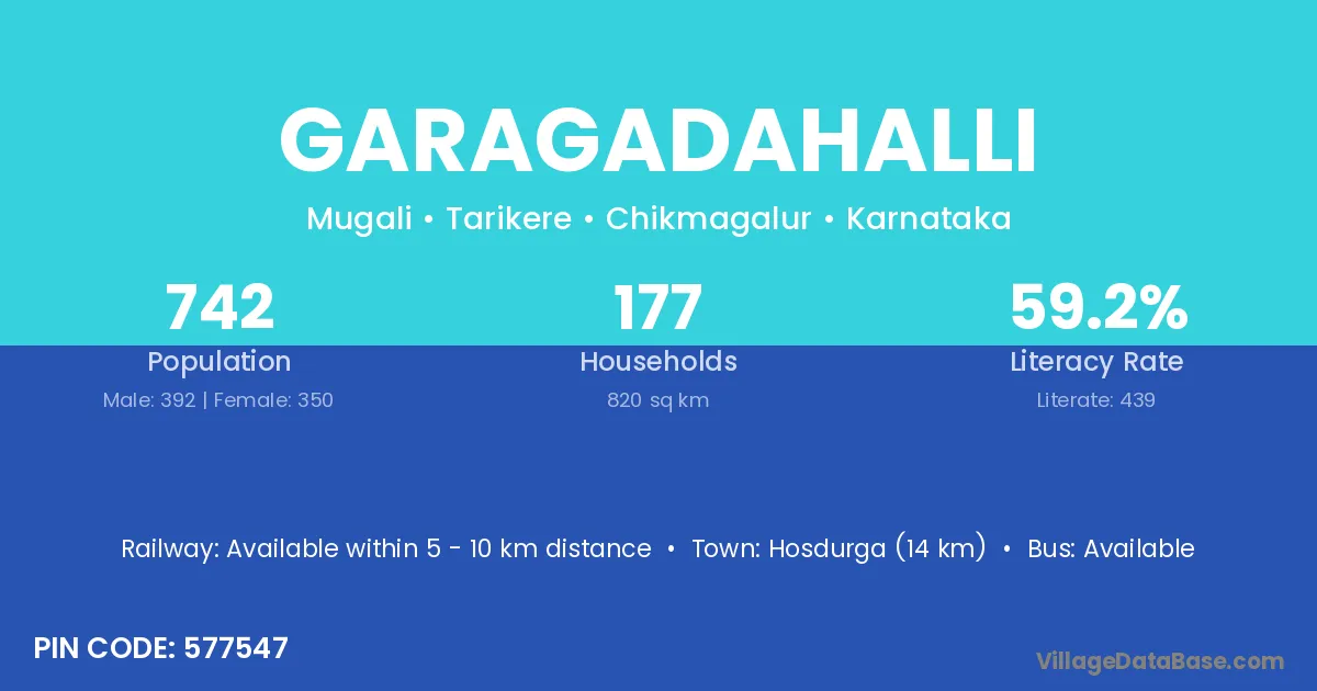 Hosdurga (14 km) is the nearest town to Garagadahalli village for major economic activities and is located approximately 14 km away.