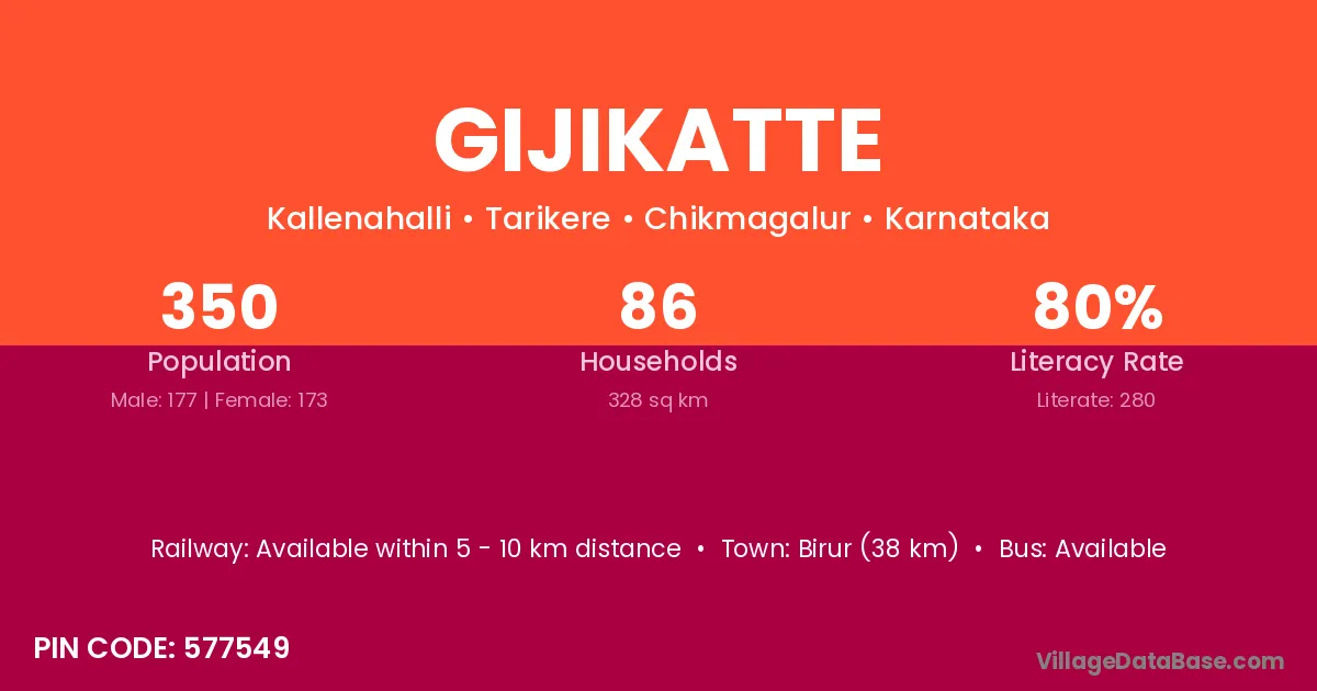 Birur (38 km) is the nearest town to Gijikatte village for major economic activities and is located approximately 38 km away.