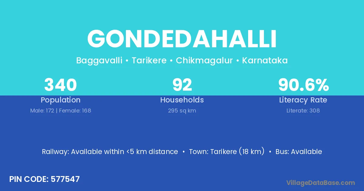 Tarikere (18 km) is the nearest town to Gondedahalli village for major economic activities and is located approximately 18 km away.