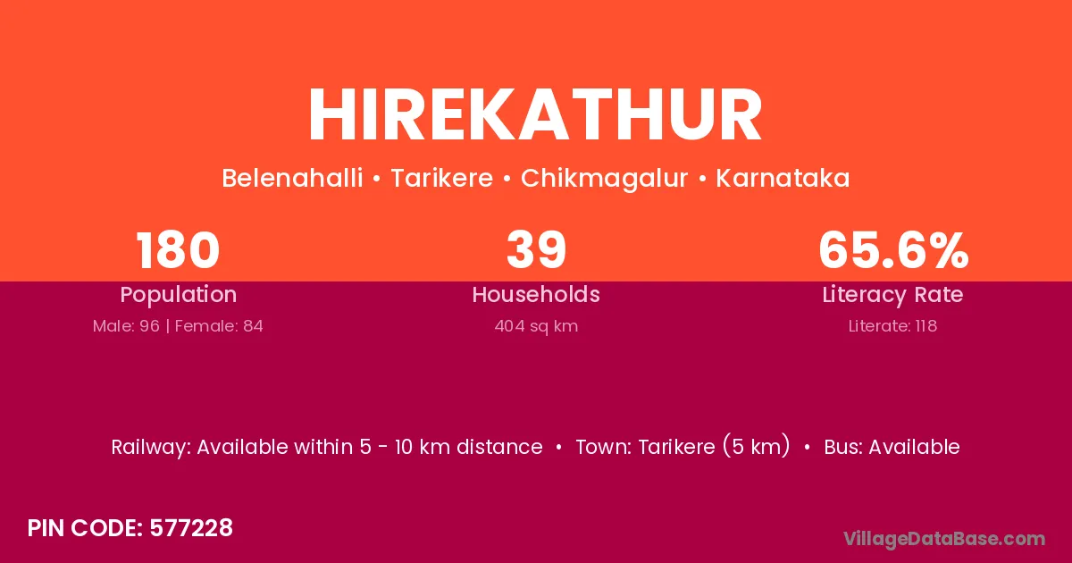 Tarikere (5 km) is the nearest town to Hirekathur village for major economic activities and is located approximately 5 km away.