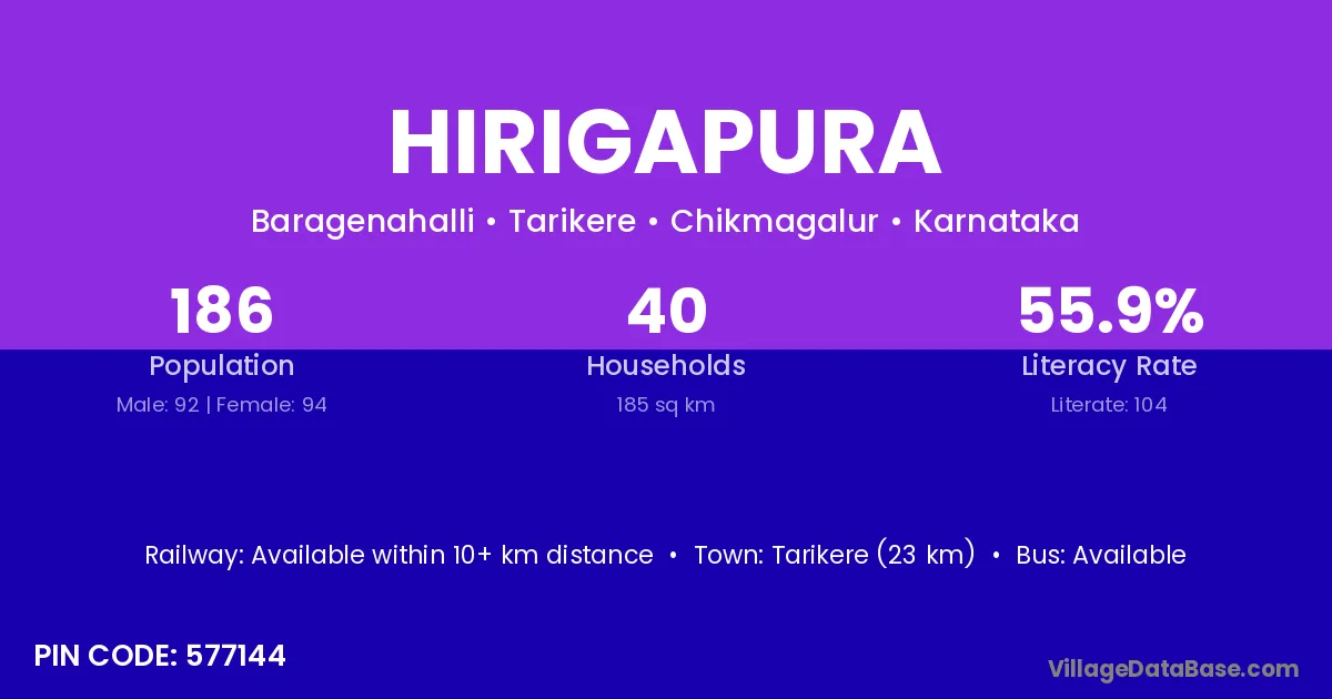 Tarikere (23 km) is the nearest town to Hirigapura village for major economic activities and is located approximately 23 km away.