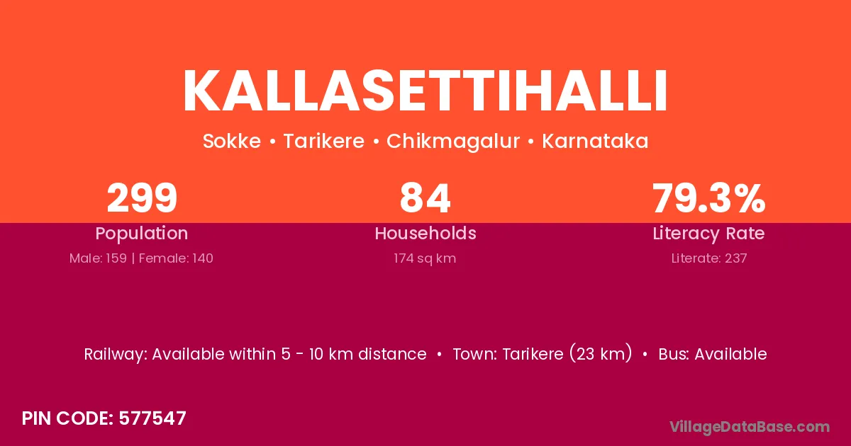 Tarikere (23 km) is the nearest town to Kallasettihalli village for major economic activities and is located approximately 23 km away.