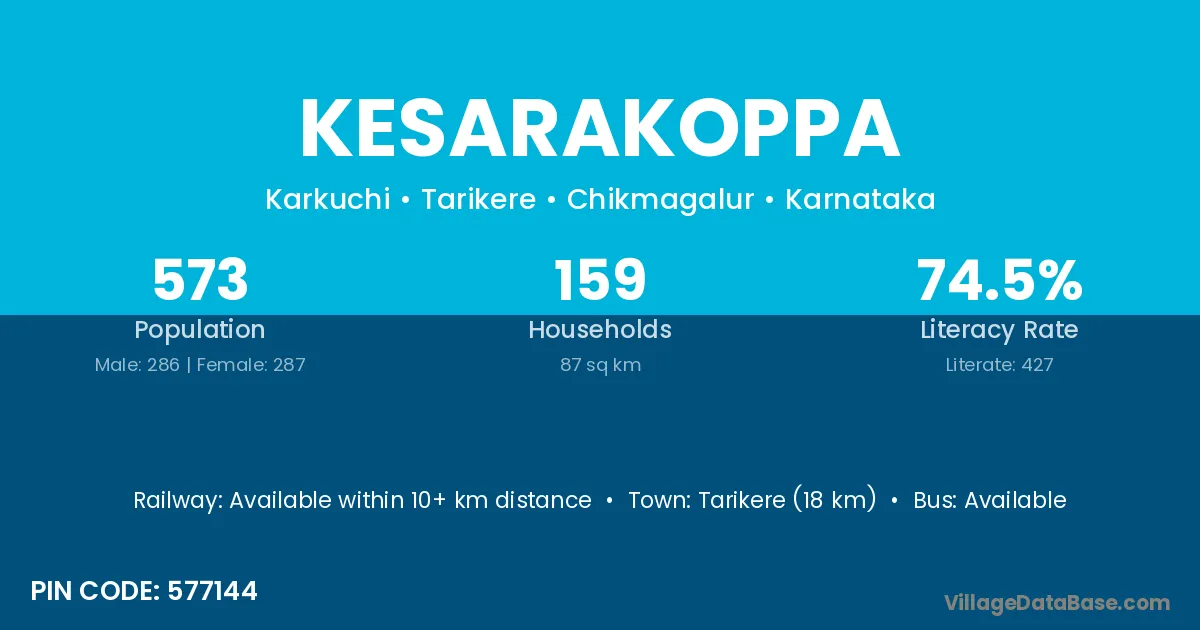 Kesarakoppa village has a total population of 573 people, of which 286 are males and 287 are females.