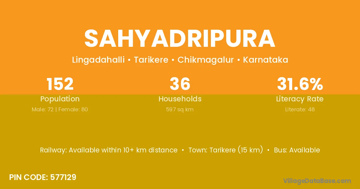 Tarikere (15 km) is the nearest town to Sahyadripura village for major economic activities and is located approximately 15 km away.