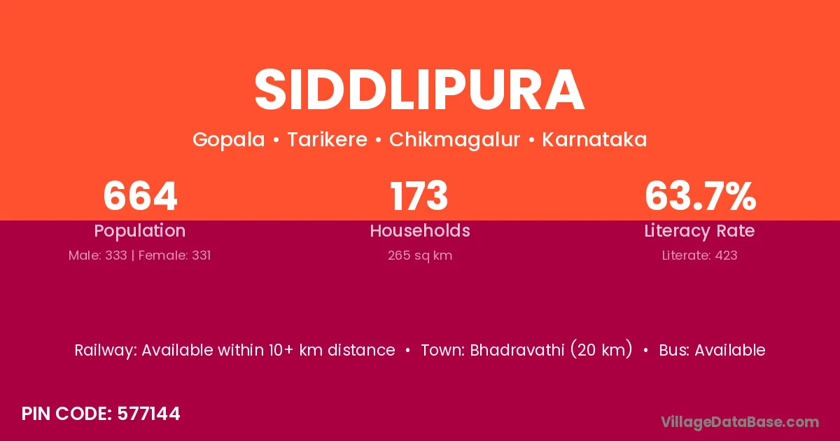 Bhadravathi (20 km) is the nearest town to Siddlipura village for major economic activities and is located approximately 20 km away.