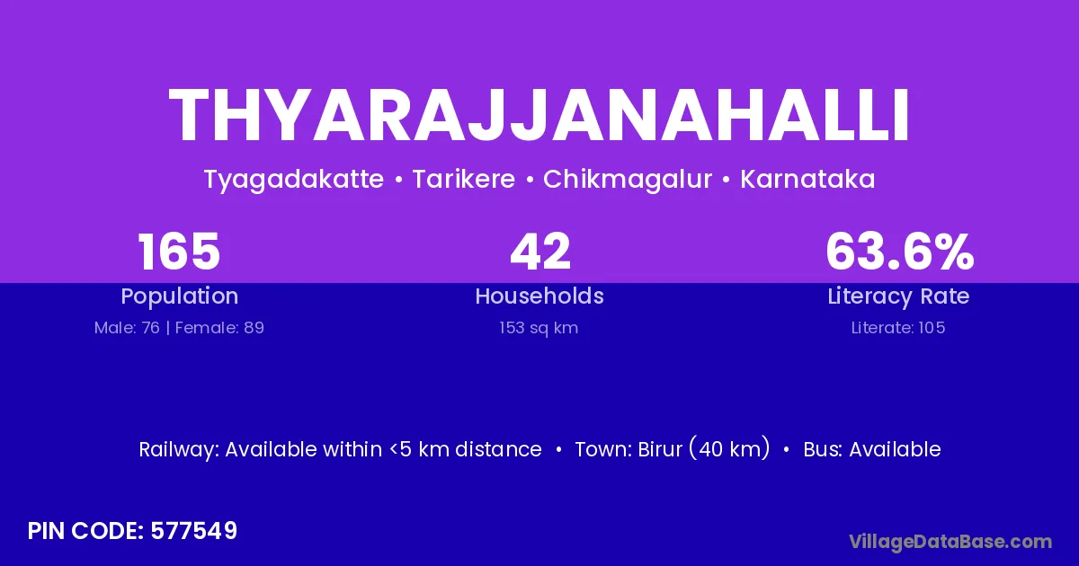 Birur (40 km) is the nearest town to Thyarajjanahalli village for major economic activities and is located approximately 40 km away.