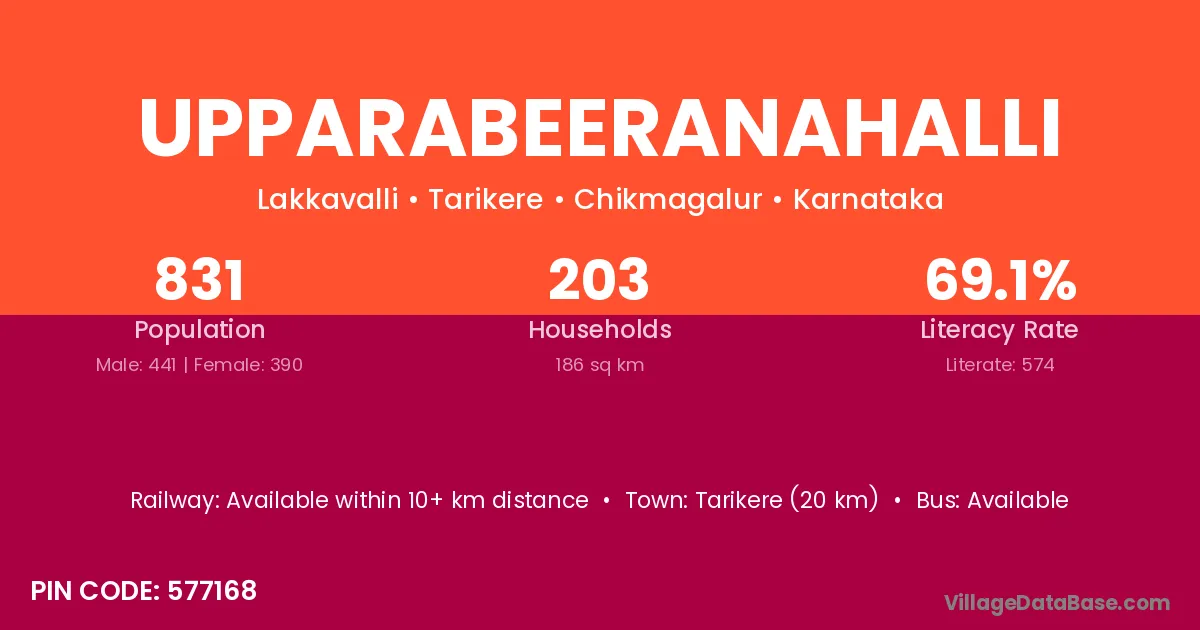 Upparabeeranahalli village has a total population of 831 people, of which 441 are males and 390 are females.