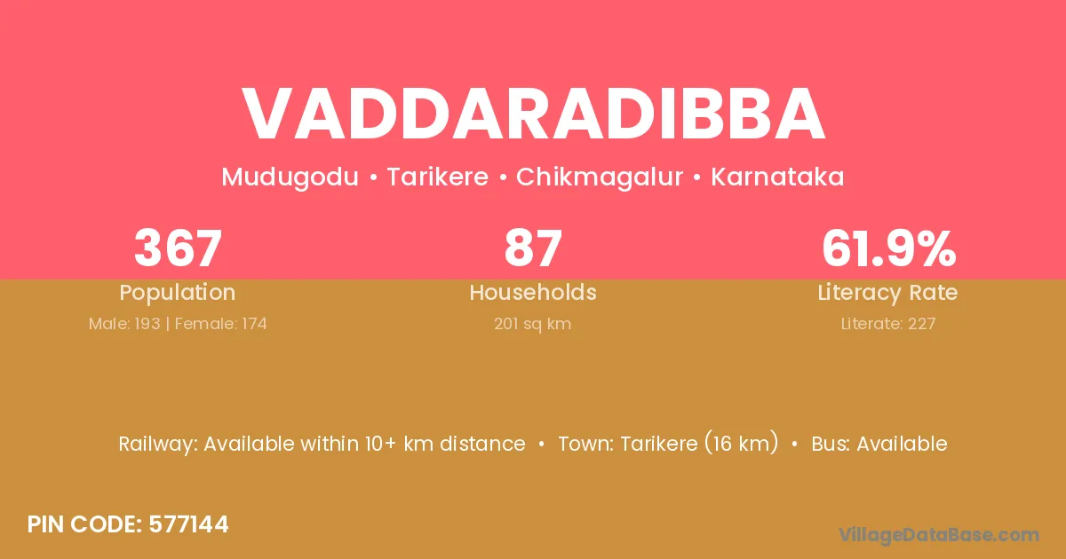 Tarikere (16 km) is the nearest town to Vaddaradibba village for major economic activities and is located approximately 16 km away.