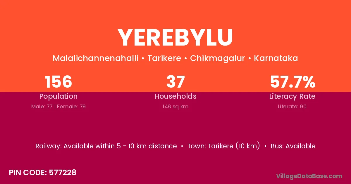Tarikere (10 km) is the nearest town to Yerebylu village for major economic activities and is located approximately 10 km away.