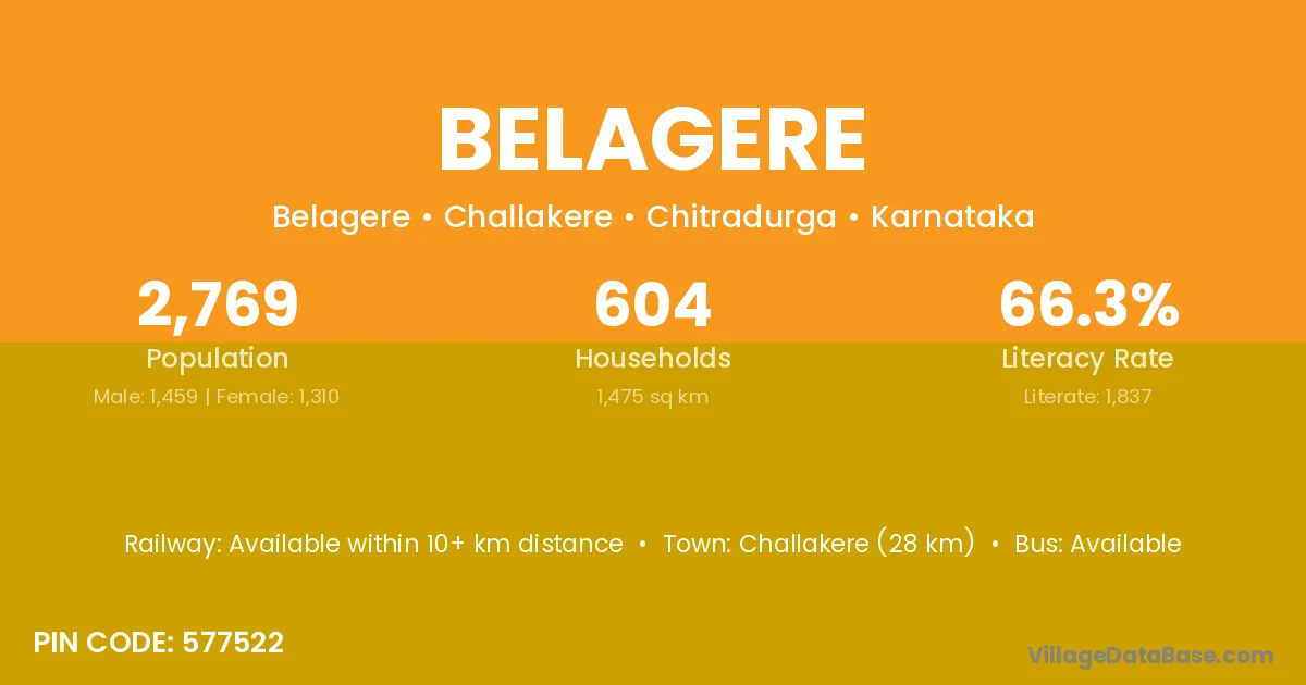 Challakere (28 km) is the nearest town to Belagere village for major economic activities and is located approximately 28 km away.