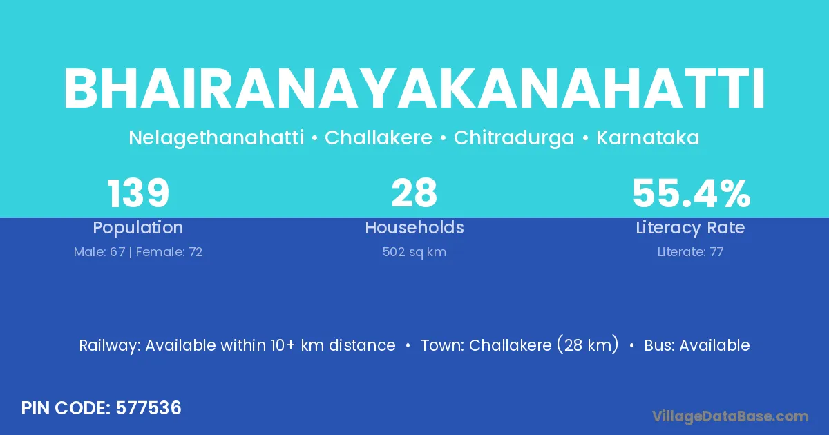 Challakere (28 km) is the nearest town to Bhairanayakanahatti village for major economic activities and is located approximately 28 km away.
