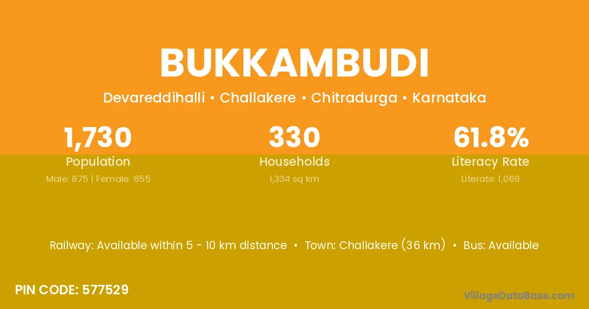 Challakere (36 km) is the nearest town to Bukkambudi village for major economic activities and is located approximately 36 km away.