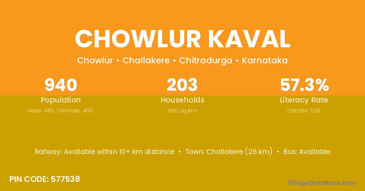 Challakere (26 km) is the nearest town to Chowlur Kaval village for major economic activities and is located approximately 26 km away.