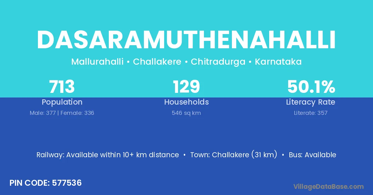 Challakere (31 km) is the nearest town to Dasaramuthenahalli village for major economic activities and is located approximately 31 km away.
