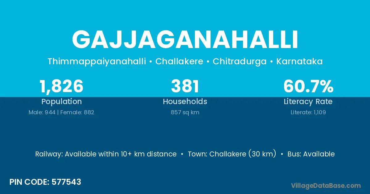 Challakere (30 km) is the nearest town to Gajjaganahalli village for major economic activities and is located approximately 30 km away.