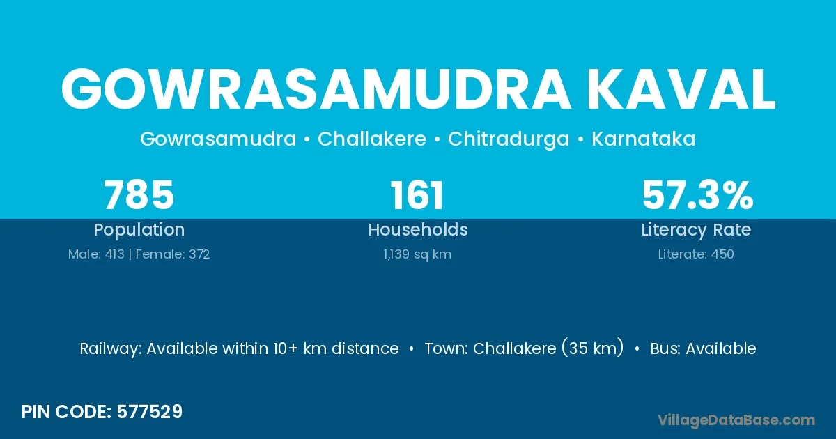 Gowrasamudra Kaval village has a total population of 785 people, of which 413 are males and 372 are females.