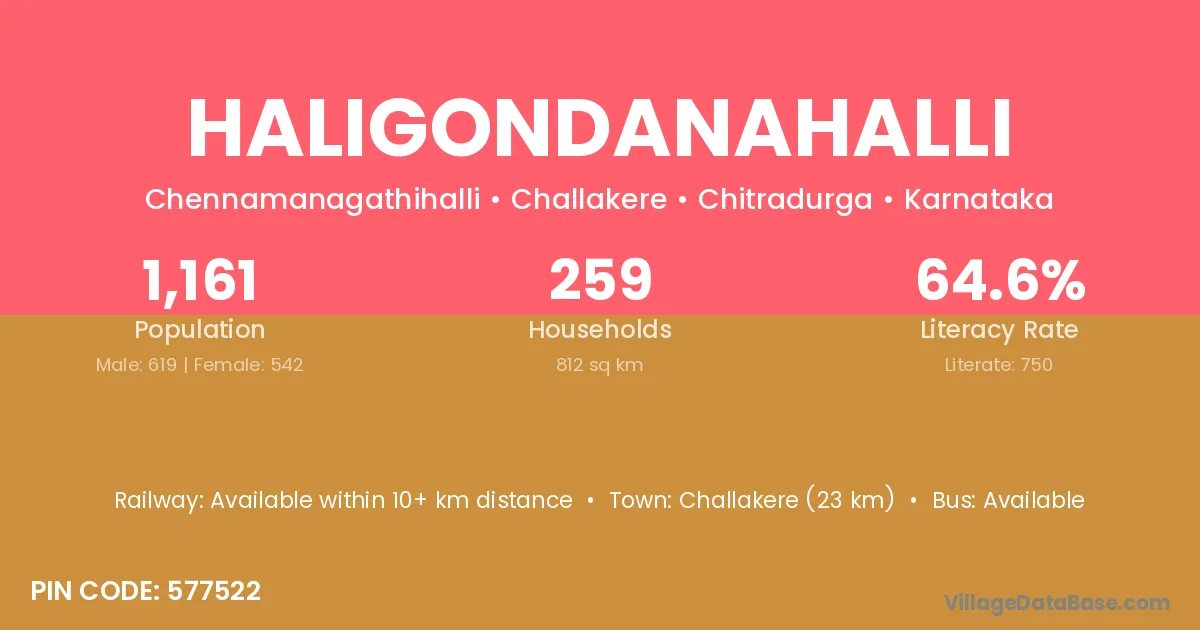 Haligondanahalli village has a total population of 1,161 people, of which 619 are males and 542 are females.