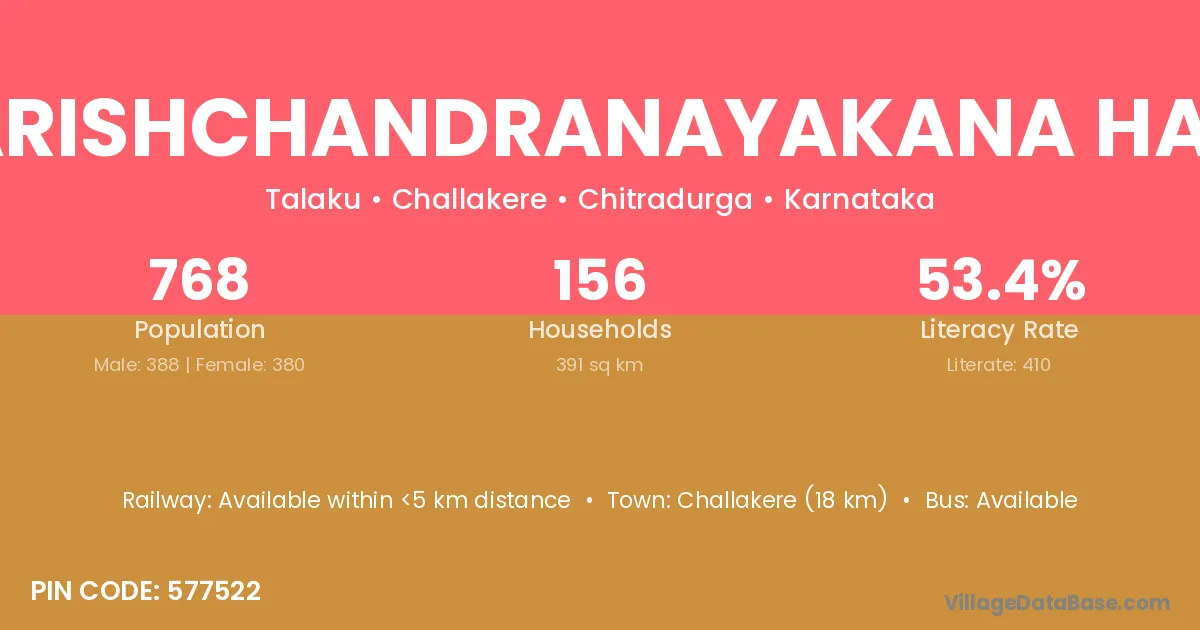 Harishchandranayakana Halli village has a total population of 768 people, of which 388 are males and 380 are females.