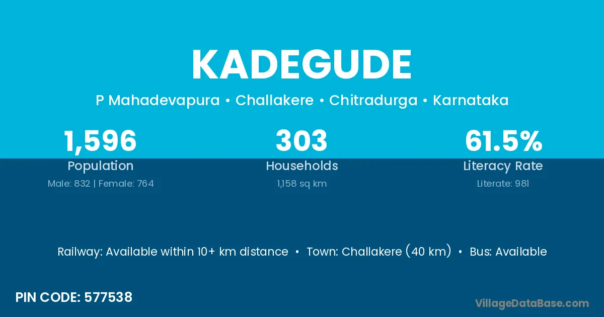 Challakere (40 km) is the nearest town to Kadegude village for major economic activities and is located approximately 40 km away.