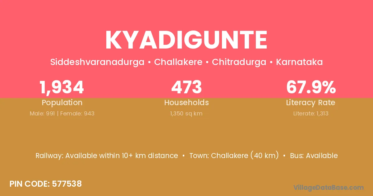Kyadigunte village has a total population of 1,934 people, of which 991 are males and 943 are females.
